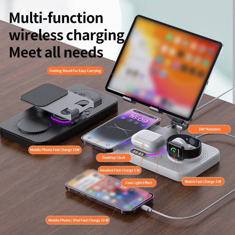 6in 1 Multiple Devices Fast Wireless Charger Pad with Clock Night Light Mobile Phone Tablet Holder Stand Wireless Charging Station for iPhone 16 15 14 13 12 11 X XR XS Pro Max Mini for Apple Watch for iwatch 10 9 8 7 6 5 4 Ultra SE for iPad